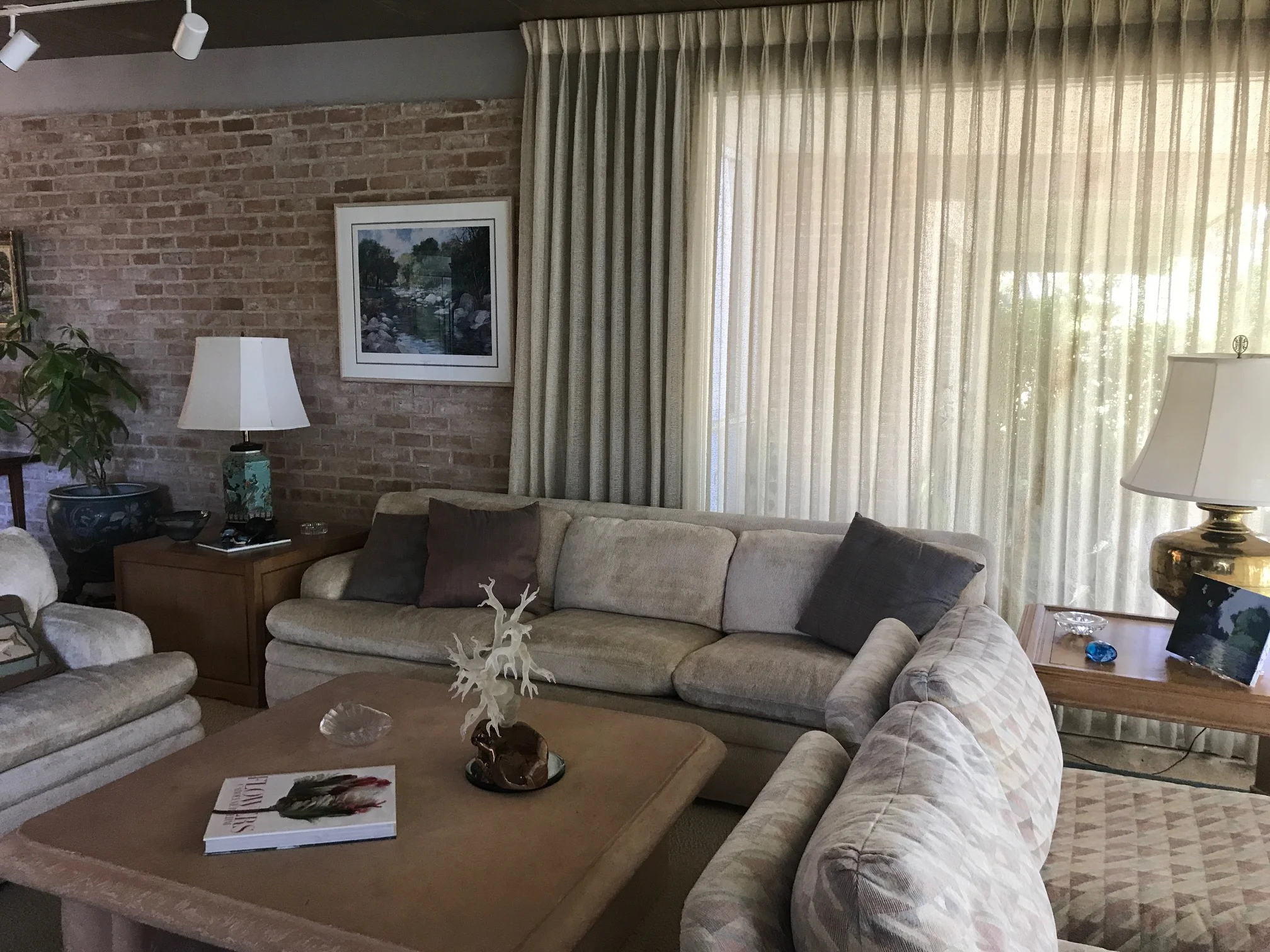 In the living room, we reupholstered a mid-century style sofa that the clients had in storage from that era. Chairs were added in a similar style. The leather chairs swivel so the owners can sit and enjoy their lake view, cocktail in hand. The rug was selected to tie in the natural coral colored adobe brick walls and the blue of the water. It mimic’s the movement of the lake. The 50’s style light fixture, that our designer fell in love with, is hung in the corner of the room creating a cozy ambiance. The black chest was found at an antique shop and is original to the era.