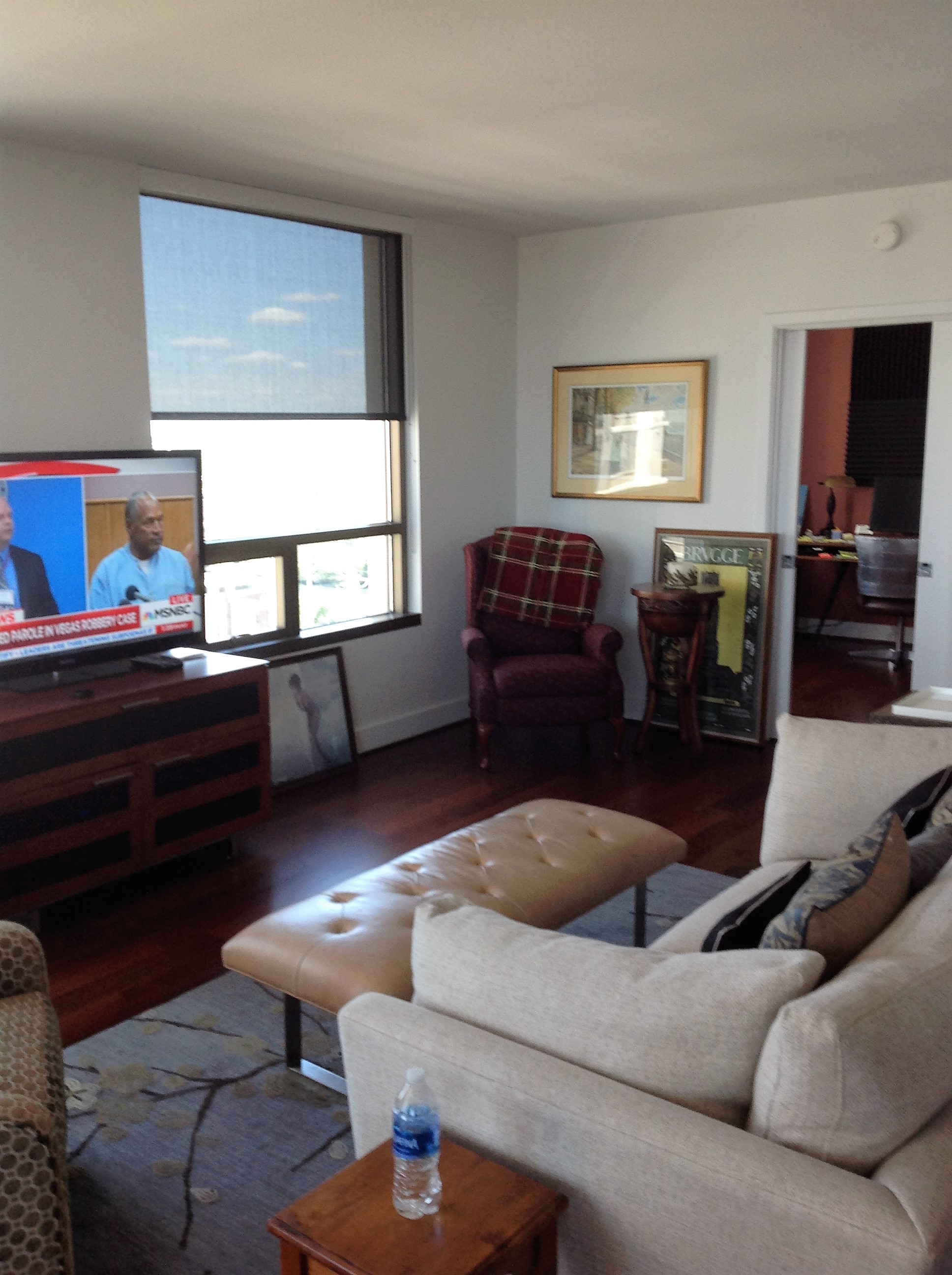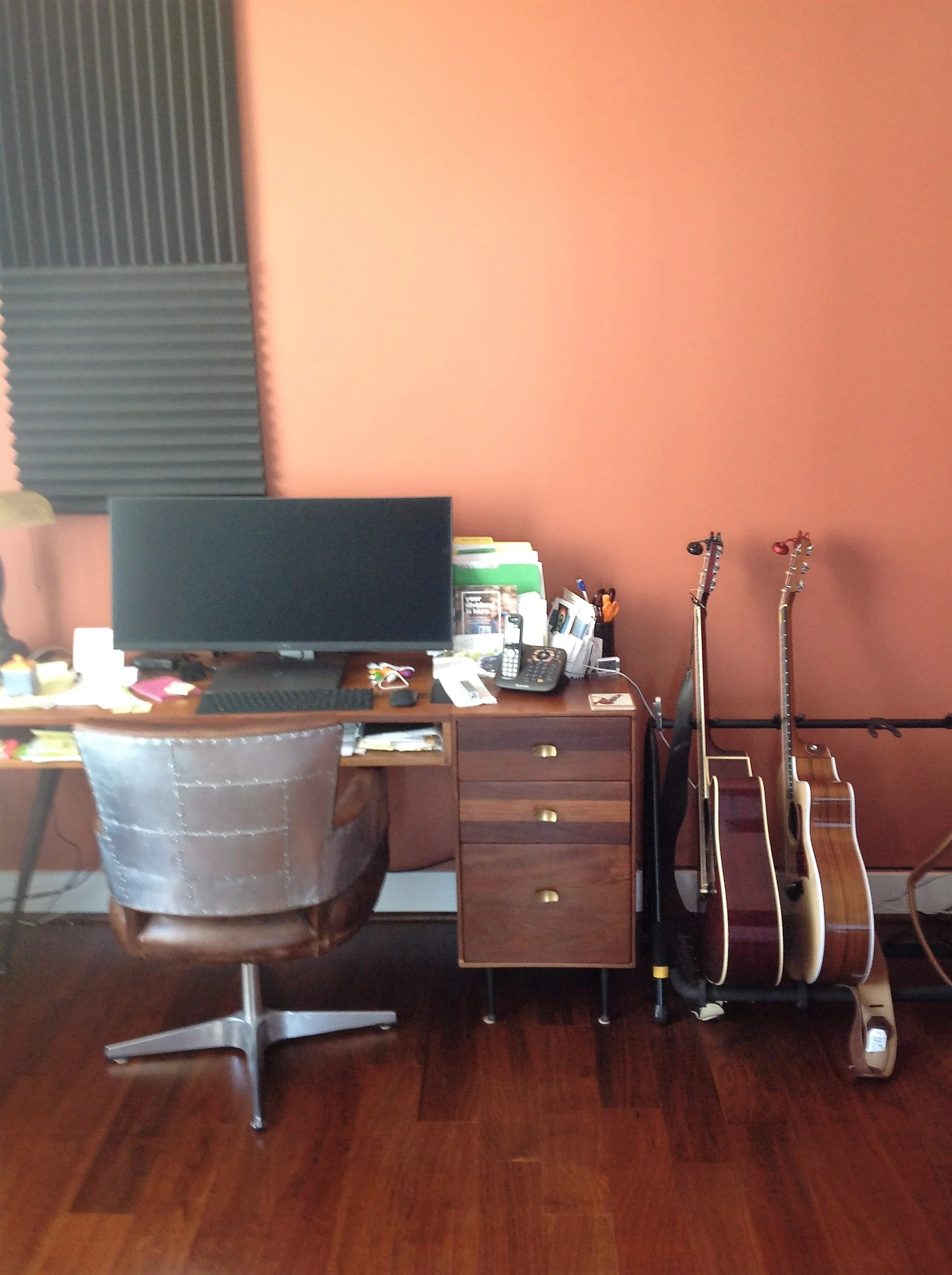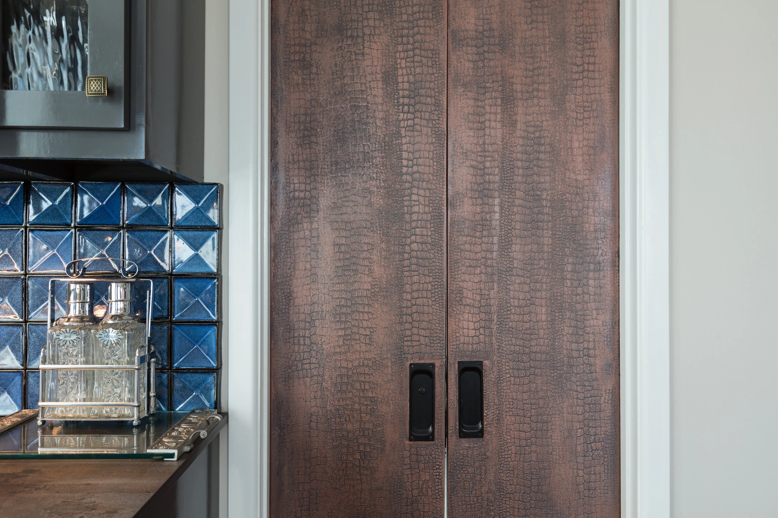 In the study, pocket doors were finished in faux alligator skin. This room serves as a place for our clients to display their guitar collection and other beloved music artifacts, as well as a place to work and create. The new muted color palette creates a calm vibe and puts the focus on the city view. We added custom bench seating under the window, where our clients can play guitar while enjoying the view.