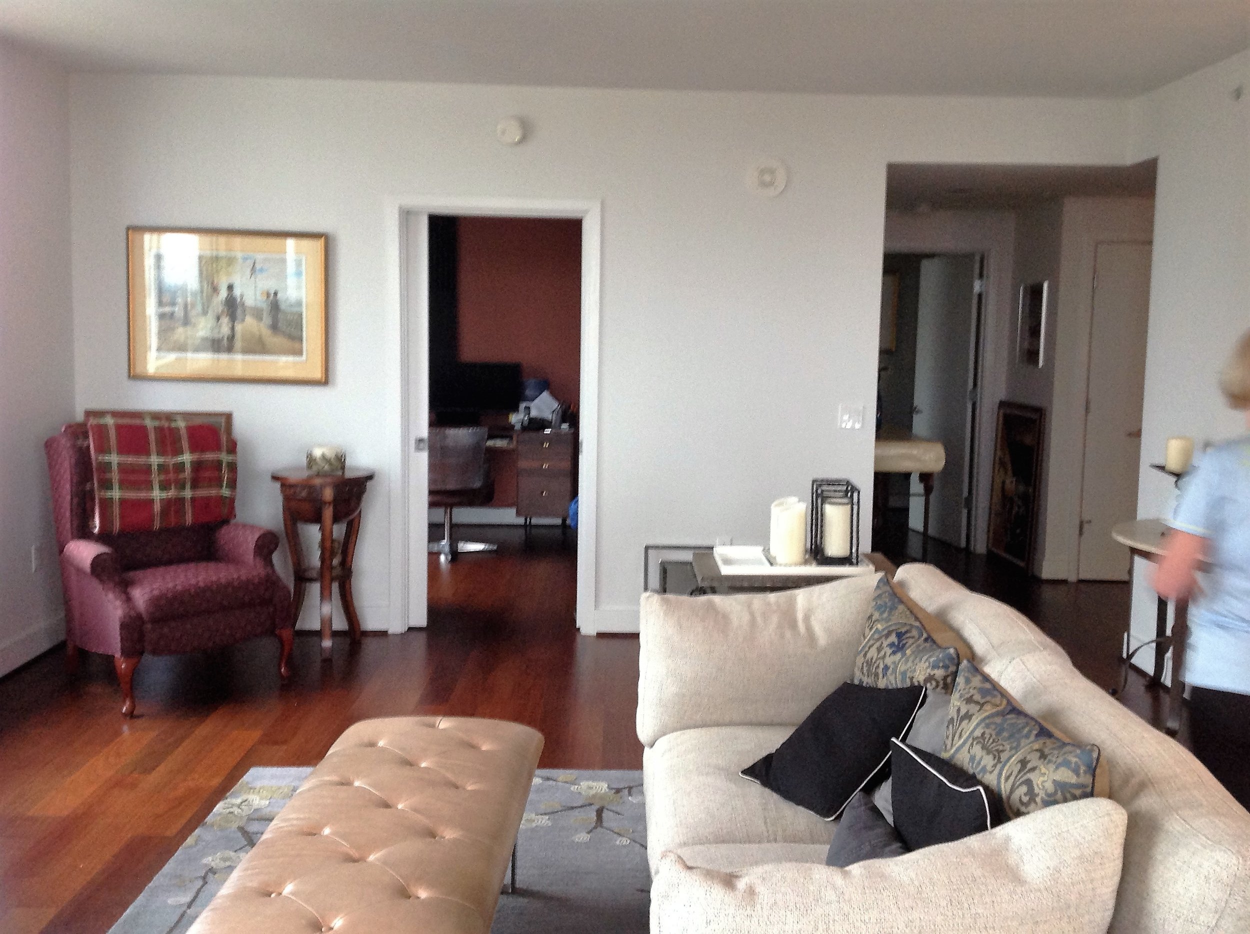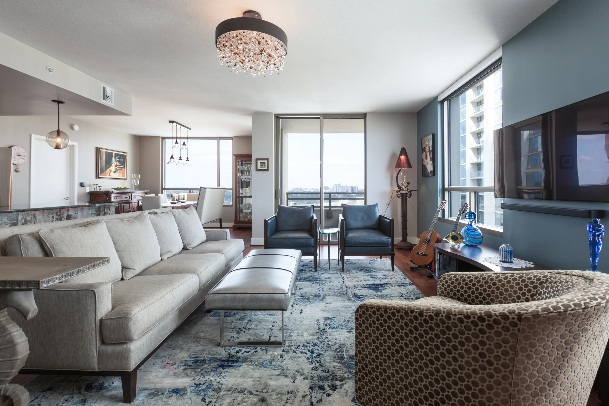 The living room rug, in serene shades of blue and aqua, was the first selection. It’s colors reflect the ever-shifting view of the sky and add a natural element to this city condo. Our clients were initially unsure of the blue accent wall, but as she does best, designer Janice Hanks was able to coax them out of their comfort zone for an end result that they love. The chandelier elevates the eye and adds sparkle. An existing ottoman was reupholstered in sliver leather, and a custom sofa and two blue leather club chairs anchor the flow of color in the space.