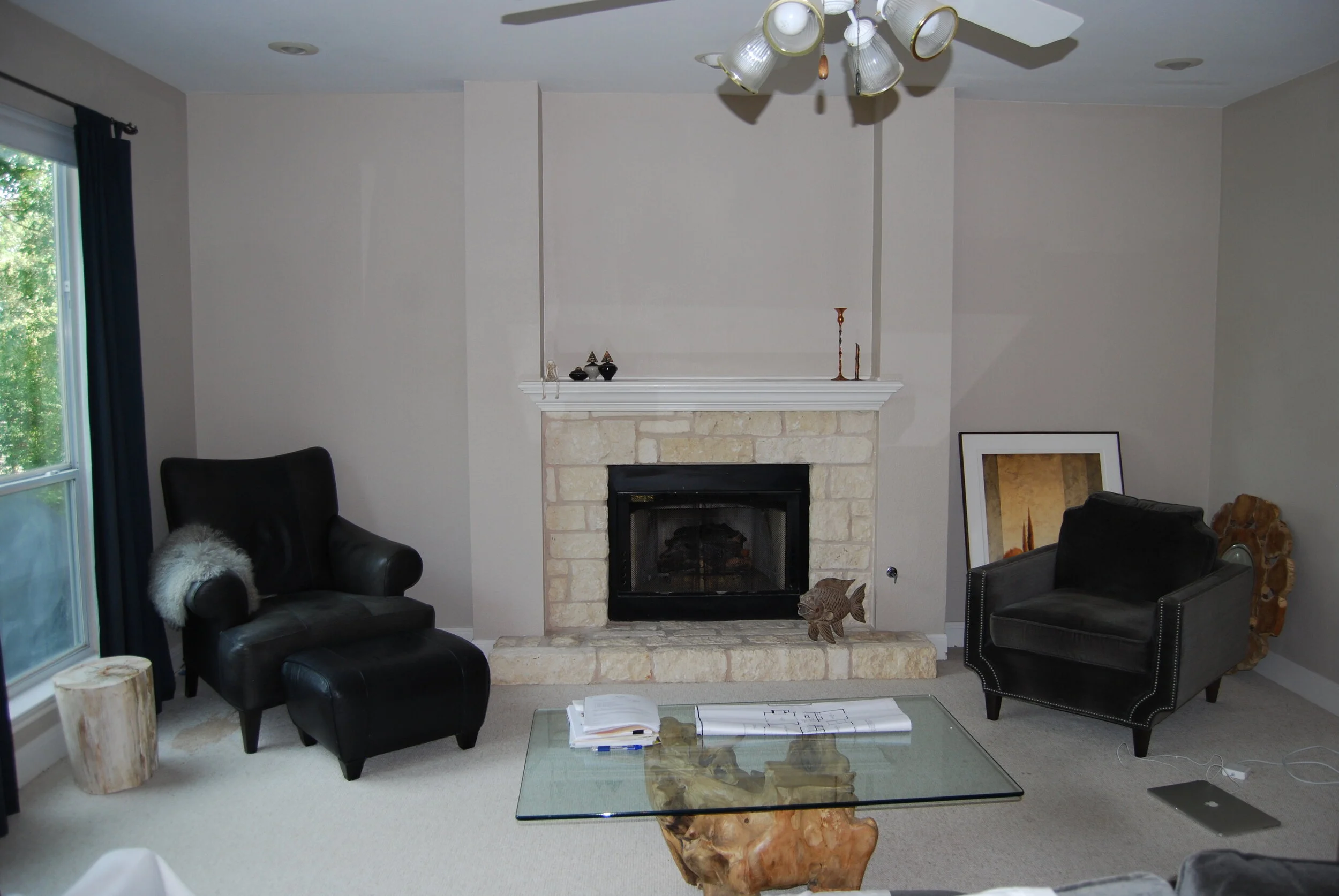To bring in the organic shape and feel of natural elements, we added a solid pecan mantle with a black walnut stain. The mantle, weighing over 300 pounds, had to be carefully mounted! We love how it transforms the fireplace into a true focal point.