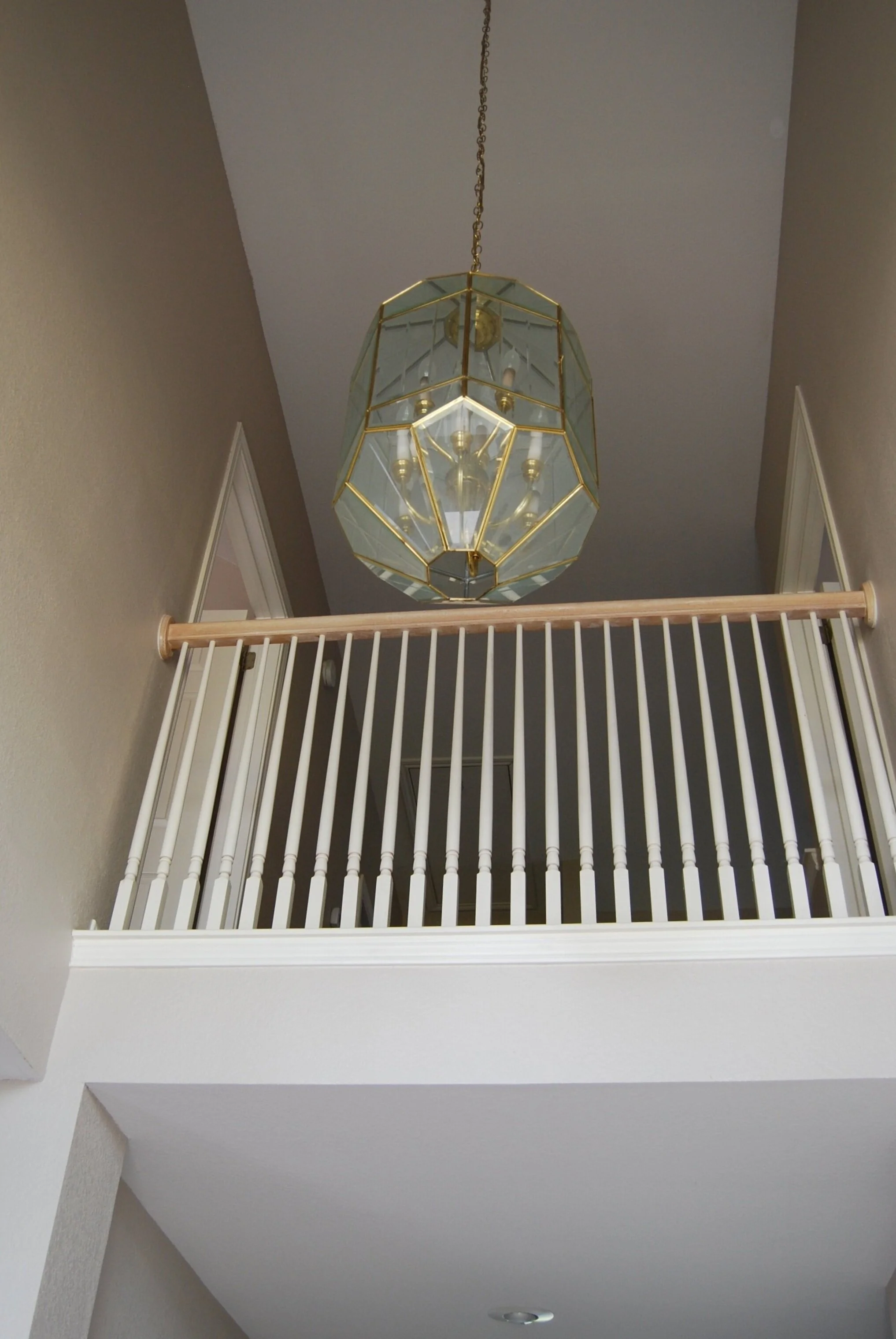 In the entryway, we replaced an old chandelier with dramatic, sculptural lighting. A barn door took the place of the old double doors to the study, giving the room a more spacious feel. A new metal railing completes the modern look.